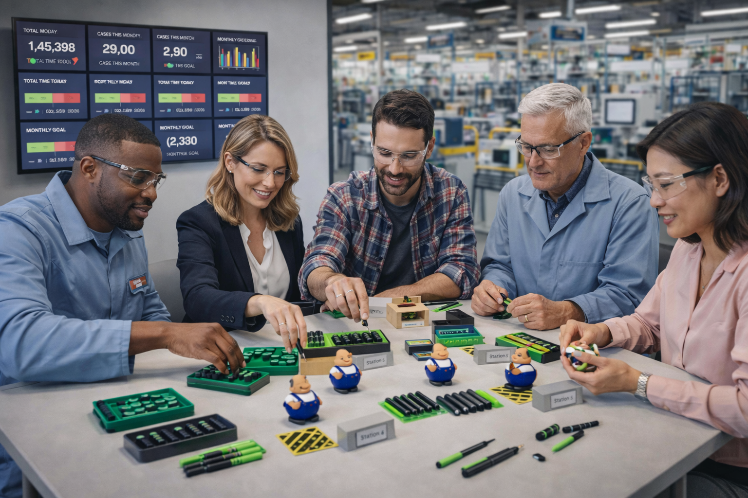 Simulación realista de una planta productiva donde los equipos identifican desperdicios, equilibran procesos y mejoran flujo, calidad y productividad aplicando Lean en tiempo real.